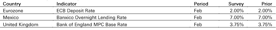 The European Central Bank remains firmly on hold, and is expected to keep interest rates at 2.00%, but the disinflationary impact of a stronger currency could open the door to a further cut later in the year.