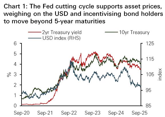 • The re-start of the Fed’s rate cut cycle boosts equities, bonds and gold to new highs. Historically, equities and bonds tend to perform well in the 12 months after the Fed resumes easing. We now expect two more 0.25% rate cuts this year. As the 10-year US Treasury yield is now below our year-end forecast of 4.3%, we reduce our maturity preference for US Treasuries to 5-7 years.