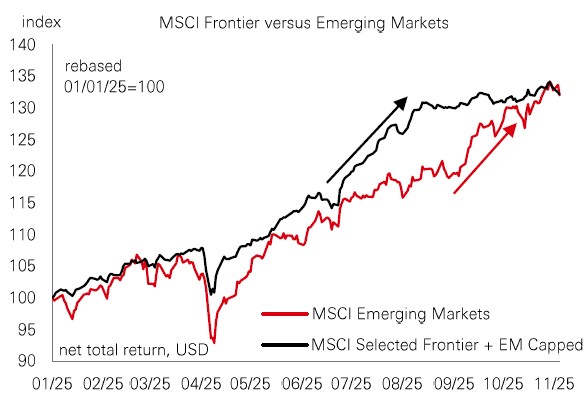 Investor interest in both Emerging and Frontier Market stocks has been a major theme in markets in 2025. But while both benchmark indices have delivered year-to-date returns above 30%, they’ve been on quite different journeys. After April’s Liberation Day sell-off, FM stocks had a very strong summer, as Vietnam (a big chunk of the FM index) secured an early trade deal with the US. But then, EM stocks caught up, boosted by September and October’s Fed rate cuts. Liberation Day was also less severe for FM stocks, and volatility has been less pronounced so far in 2025. |