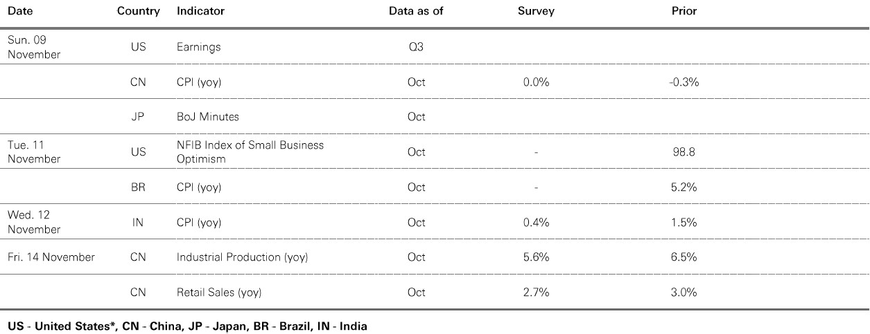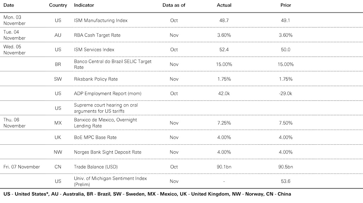 Source: HSBC Asset Management. Data as at 7.30am UK time 07 November 2025. For informational purposes only and should not be construed as a recommendation to invest in the specific country, product, strategy, sector or security. Any views expressed were held at the time of preparation and are subject to change without notice. Any forecast, projection or target where provided is indicative only and is not guaranteed in any way. *The ongoing government shutdown in the US may delay the expected releases of official data.