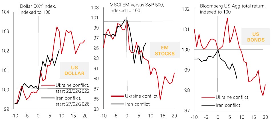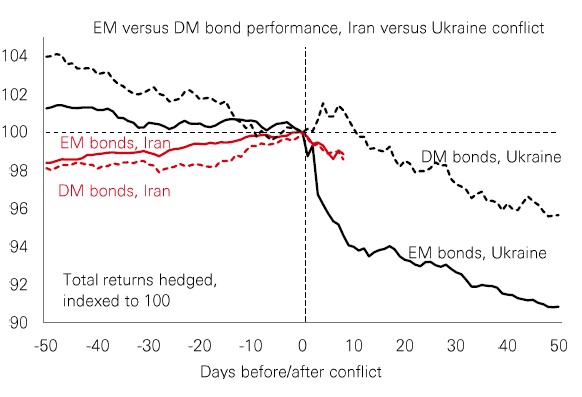Second, this time is different versus previous risk-off episodes. The dollar is up – but to a more limited extent than we would usually expect. Meanwhile, global bonds are down – investors reckon the Fed will back away from cuts, and the ECB might even hike in 2026. And EM stocks and bonds have been much more resilient than usual. That’s impressive and reflects the new reality of improved macro and policy fundamentals.