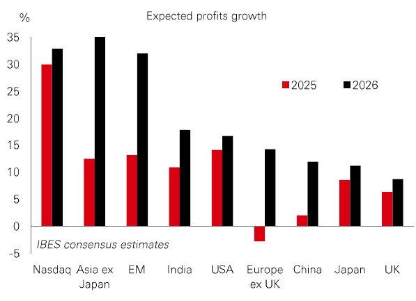 Last year’s rally in emerging market stocks was mainly driven by a re-rating, helped by the tailwinds of a softer US dollar and worries over US market concentration. So, coming into 2026, further EM momentum really depended on firms delivering solid profits growth. The good news is that despite increasing geopolitical risks, analyst expectations on EM have been rising, particularly in Asia, where profits growth forecasts have jumped from 20% to more than 30% in recent months. A lot of this fresh optimism has come from exposure to AI-related sectors such as semiconductors and hardware, boosting expectations for South Korea and Taiwan. |