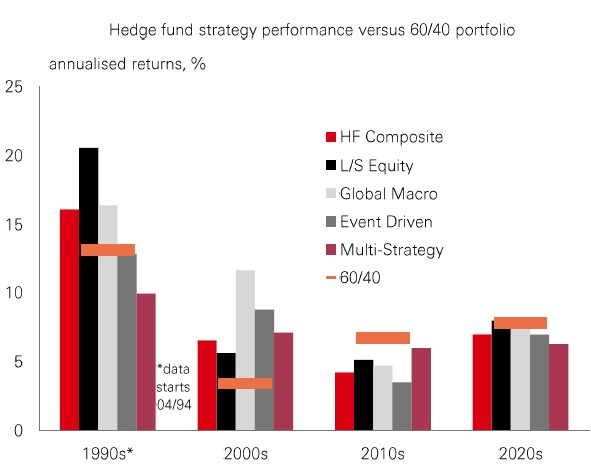 With geopolitics causing turmoil in markets – and stocks and bonds both under pressure – the traditional 60/40 portfolio model continues to look vulnerable. For investors seeking better protection than bonds have recently provided, hedge funds could be an alternative. In the period following the global financial crisis, bonds tended to be an effective hedge for portfolios, leaving hedge funds on the sidelines. But today’s environment looks more like the 1990s, a period when hedge fund returns were strong. Inflation was stickier, the world was more fragmented, central banks’ role a bit more limited, and fiscal policy more active. These strategies can take a flexible approach, benefiting from short-term opportunities in both rising and falling markets – ideal amid volatile conditions. |