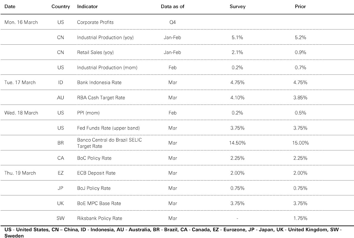Global equity markets were on course to finish the week mixed but mostly lower, with investors cautious amid geopolitical tensions and the ongoing oil price shock. In the US, major stock indices extended weekly losses. European markets outperformed, with the Euro Stoxx 50 set to edge higher. Conversely, Japanese indices drifted lower despite a weaker yen. Other Asian markets broadly weakened: Sensex dropped, while Kospi retreated further. Both Hang Seng and Shanghai Composite index fell. Among other emerging markets, Latin American stocks consolidated following recent declines. The US dollar posted modest gains against major currencies, with gold prices paring losses. Oil-driven inflation jitters pushed 10-year government bond yields higher, led by UK Gilts. US Treasuries broadly weakened ahead of this week’s Fed rate decision.
