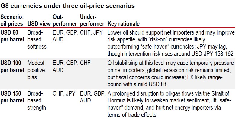 Middle East geopolitics remain the primary driver of FX markets, but the headlines are difficult to interpret as tensions can escalate and ease quickly. We believe market direction may hinge on a few practical indicators, notably the extent of shipping disruption through the Strait of Hormuz and the resulting path for oil prices. As geopolitical risk rises and falls, oil can move sharply, shifting market sentiment between “risk-off” and “risk-on”. The table below summarises potential G8 currency performance across three oil-price scenarios.