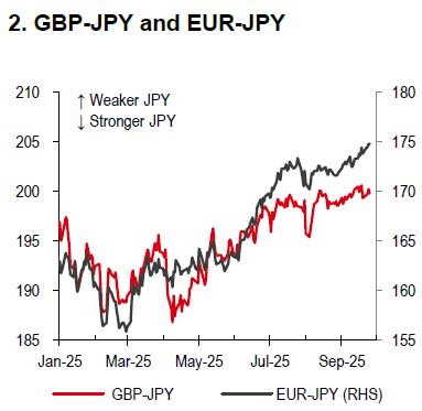 It is worth noting that the September “dot plot” shows that the Fed is basically evenly divided between the need for one or two cuts during 4Q25. With a c90% chance of a Fed rate cut at the 28-29 October meeting in the price (Bloomberg, 25 September 2025), it may be hard for US data (like non-farm payroll on 3 October and CPI on 15 October) to out-dove markets and the risks are skewed to a bigger USD bullish reaction if the numbers land hawkishly.