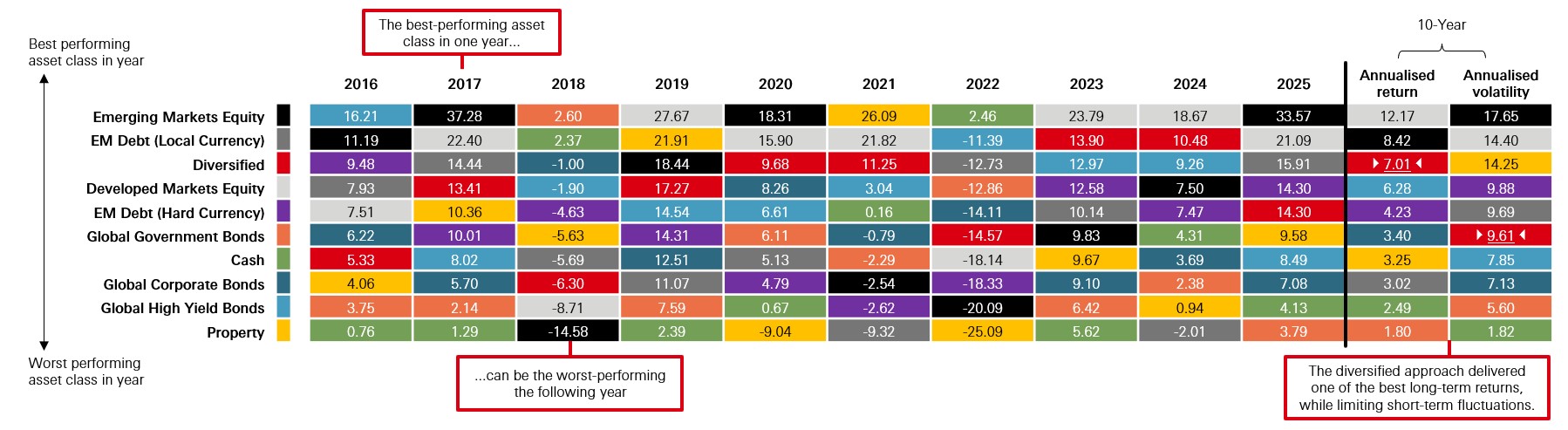 Source: Morningstar, HSBC Asset Management, data to 31 December 2025. All returns in USD, total return. Indices used: DM Equities: MSCI World Index; EM Equities: MSCI Emerging Market Equity; EMD Local currency: Bloomberg EM Local Currency Government Diversified; EMD Hard currency: ICE Bank of America Merrill Lynch Emerging Market Bond Index; Global Corporate Bond: Bloomberg Barclays Global Aggregate Corporate Bond Index; Global High Yield Bond: ICE Bank of America Merrill Lynch Global High Yield; Global Government Bond: FTSE World Government Bond Index; Property: FTSE EPPRA/NAREIT Developed Property Index; Cash: SOFR 3 Month; Diversified: 'Diversified' performance was calculated using a representative, moderate-risk asset allocation to all of the stated indices. Bond indices are hedged. Equities are unhedged. Past performance is no guarantee of future returns.