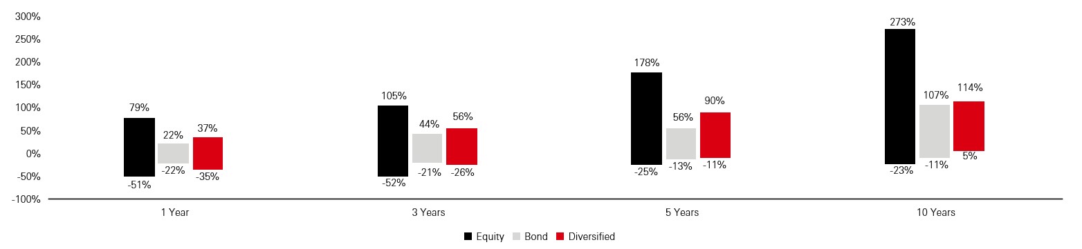 Currency: USD. Source: Bloomberg, HSBC Asset Management, as at 31 December 2025. Indices used: Equities – MSCI AC World Total Return Index. Bonds – Bloomberg Global-Aggregate Total Return Index Value Unhedged USD. 'Diversified’ is a representative, balanced asset allocation across global equities, bonds and alternatives. Bond indices are hedged. Equities are unhedged. Past performance is no guarantee of future returns.