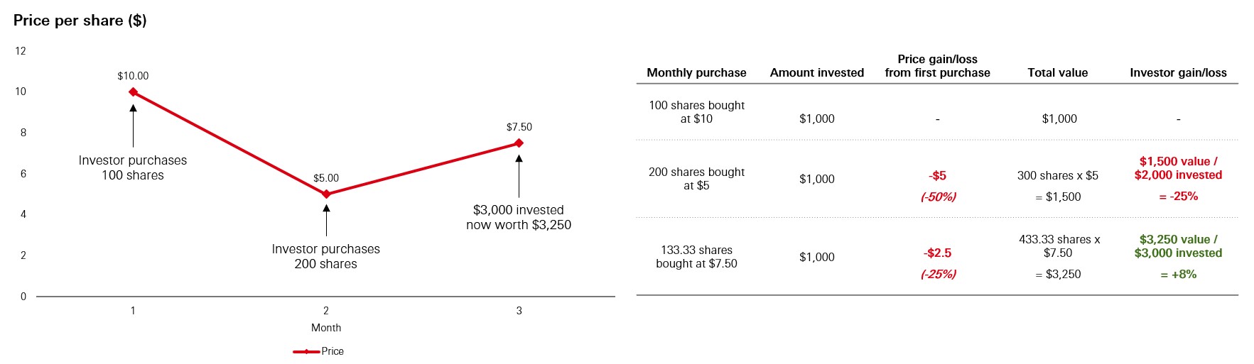 Even though the investor buys $1,000 worth of shares at both a price of $10 and $5 per share, the outcome is a gain. This is because investing a fixed dollar amount means buying double the number of shares at the lower $5 price versus the original amount purchased at $10.