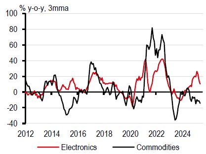 Thailand will also benefit from its new tariff advantage with China. In the US market, Thailand competes with China on HDDs, computer parts, telephone parts, and pet food. From a tariff advantage of nil to 25 ppt prior to Liberation Day, Thailand’s tariff advantage for these items now ranges from 19-35%. As a result, Thailand is likely to take some market share away from China, taking the edge off the eventual payback in frontloading demand.