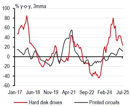 Key here to understand is that not all the surge in exports is due to frontloading demand. Thailand’s supply chains for printed circuit boards and Hard Disk Drives (HDDs) run deep, with Thailand being the second largest exporter of HDDs globally. And the boom in AI-related investments has brought renewed demand for both. HDD exports, in particular, have grown c50% y-o-y on average over the past 12 months, representing a rejuvenation of a technology that was once thought to be outdated.