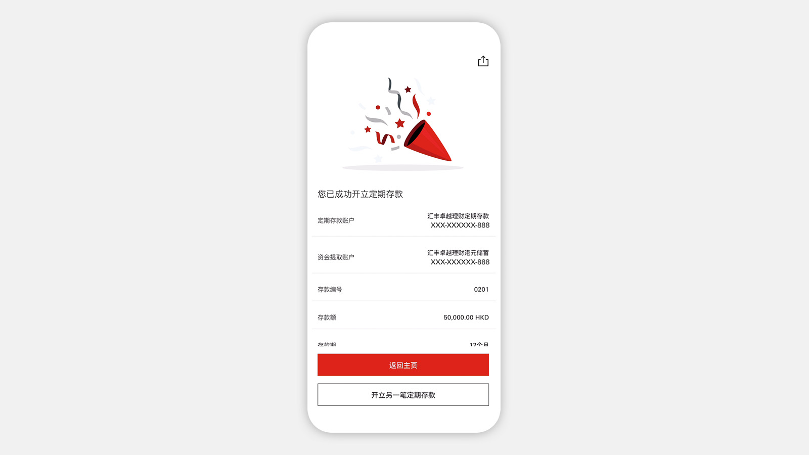 步骤4 – 核对详情,细阅并接受条款及细则(如适用),再确认您的指示。您可选择右上方的分享图标即可储存确认页面。