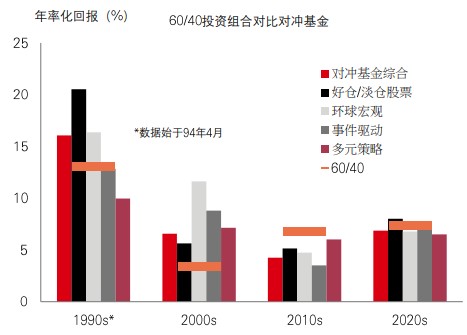 对冲基金便是选择之一。这类资产不仅提供吸引回报(过去十年,表现媲美传统60/40投资组合),与股票的关连性亦低于美国国库券。无可否认,对冲基金在2010年代的表现未如理想,但当时宏观波幅较低、股市分散度不高及利率极低,这些因素均对冲基金的表现带来了挑战。现时,宏观和市场环境更接近1990和2000年代,我们会否即将迎来此资产类别的新黄金时代?