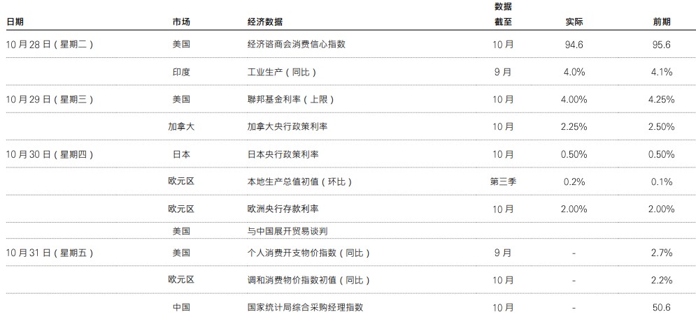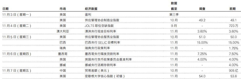 资料来源:汇丰投资管理。数据截至2025年10月31日(英国时间上午7时30分)。仅供参考,不应视为投资特定国家、产品、策略、行业或证券的建议。所表达的任何观点均截至编制为止,如有更改,恕不另行通知。所提供的任何预测、预计或目标仅供参考,概非任何形式保证。汇丰投资管理对未能达到该预测、预计或目标,概不承担任何责任。*美国政府持续停摆可能推迟官方数据公布