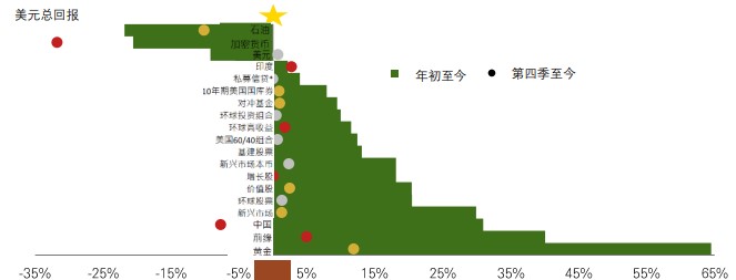 第四季其他表现优秀的资产包括新兴市场本币债券,其受惠于高实际息率、基本因素稳健,及美元转弱。黄金同样向好,是今年表现最佳的资产之一。在表现落后的资产之中,石油因为供应过剩而价格持续走低。加密货币亦遭抛售,这可能让今年于市场内积极买入的零售投资者感到忧虑。