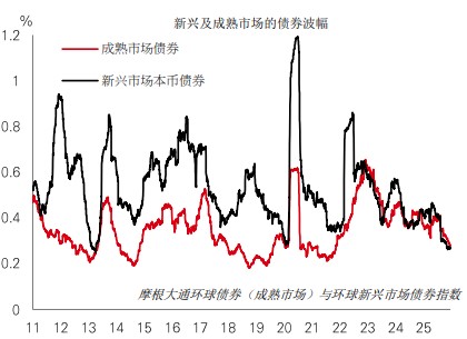 新兴市场资产的优秀表现是今年投资市场的一大焦点。新兴市场债券一度被视为高风险、高啤打系数,但其波幅现时已低于成熟市场。