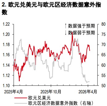 欧元方面,中东局势仍是最重要的驱动因素,但周期性因素(如经济增长、通胀及政策应对)或将决定汇率波动幅度。欧元区 4 月综合采购经理人指数(PMI)初值不及预期,私营部门自 2024 年 12 月以来首度重回收缩区间。物价分项也显示出滞胀压力。如果与霍尔木兹海峡有关的扰动持续存在,对欧元区经济增长与通胀的负面影响将进一步加剧,从而不利欧元走势(图 2)。