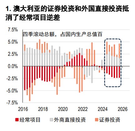 展望后市,即使外部利好因素消退,澳大利亚进一步加息的预期以及有利的结构基本面或将支撑澳元持续走强。值得注意的是,证券投资和外商直接投资(FDI)资金净流入足以抵消经常项目逆差(图 1)。此外,尽管公共部门需求上升,但澳大利亚的公共债务状况仍能有效抵御财政脆弱性。总的来说,这些因素表明澳元有望持续表现出众。