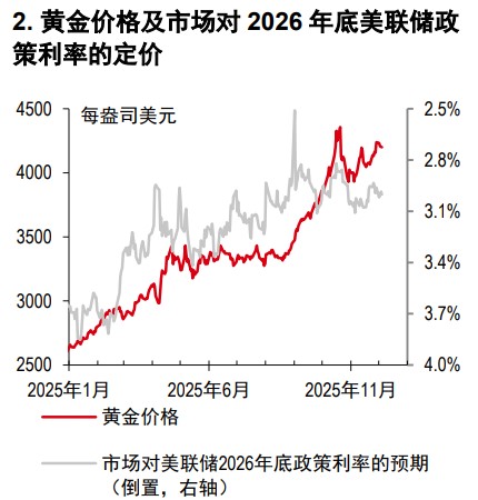 展望后市,杰罗姆·鲍威尔(Jerome Powell)的任期将于 2026 年 5 月结束,下一任美联储主席的任命将是影响市场的关键因素。新任命者不太可能促使明显鹰派的政策转变,这将导致美元在 2026 年处于守势,有利黄金走势(图 2)。此外,持续存在的地缘政治、财政和经济政策风险或会持续给黄金带来上行压力,尽管我们的贵金属分析师预计,随着供需动态的变化,2026 年下半年波动将会加剧且价格会有所回落。