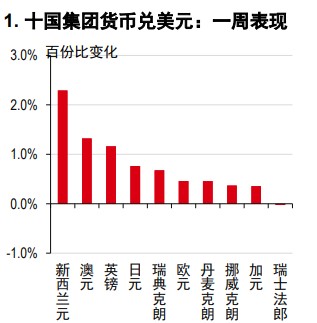 过去一周,受特定国内因素的推动,新西兰元在十国集团货币中表现最强,澳元和英镑紧随其后(图 1)。