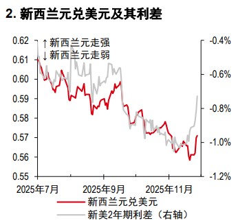 11 月 26 日,正如市场普遍预期,新西兰储备银行将政策利率下调 25 个基点至 2.25%。该央行的政策利率预测显示,政策利率将再次小幅下调 5 个基点,预计到 2026 年 6 月,利率将降至最低水平。行长霍克斯比(Christian Hawkesby)指出,这意味着 2026 年利率将保持稳定。新西兰储备银行强调,2024 年 8 月以来大幅降息 325 个基点的措施正在提振需求,且失业率已经见顶。在消息公布后,受利率走势推动,新西兰元兑美元大幅上涨(图 2)。