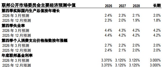 同样,最新“点阵图”并未表明政策制定者的观点发生了重大转变。 2026 年政策利率预测中值(可以说是与美元走势最相关的因素)维持在 3.375%不变,这仍意味着今年仅有一次降息(与当前市场预期基本一致)。我们的经济分析师仍然预计,美联储将在 2026 和 2027 年维持政策利率不变。宏观预测仅做了小幅调整(见下表),最显著的变化是将 2026 年个人消费支出通胀预测上调至 2.7%(此前为 2.4%)——鉴于近期的事态发展,这一调整并不出人意料。