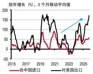 与其他依赖科技产业的经济体类似,越南也受益于人工智能驱动需求的激增。特别值得注意的是,仅对美国电子产品出口就按年大幅增长 150%(以三个月移动平均值衡量),推动越南对美国出口总额按年增长 30%。