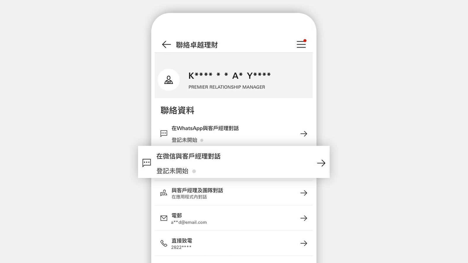 登入HSBC HK App,並點選選單圖示。選擇「聯絡滙豐卓越理財尊尚」或「聯絡卓越理財」,再選擇「在微信與客戶經理對話」。