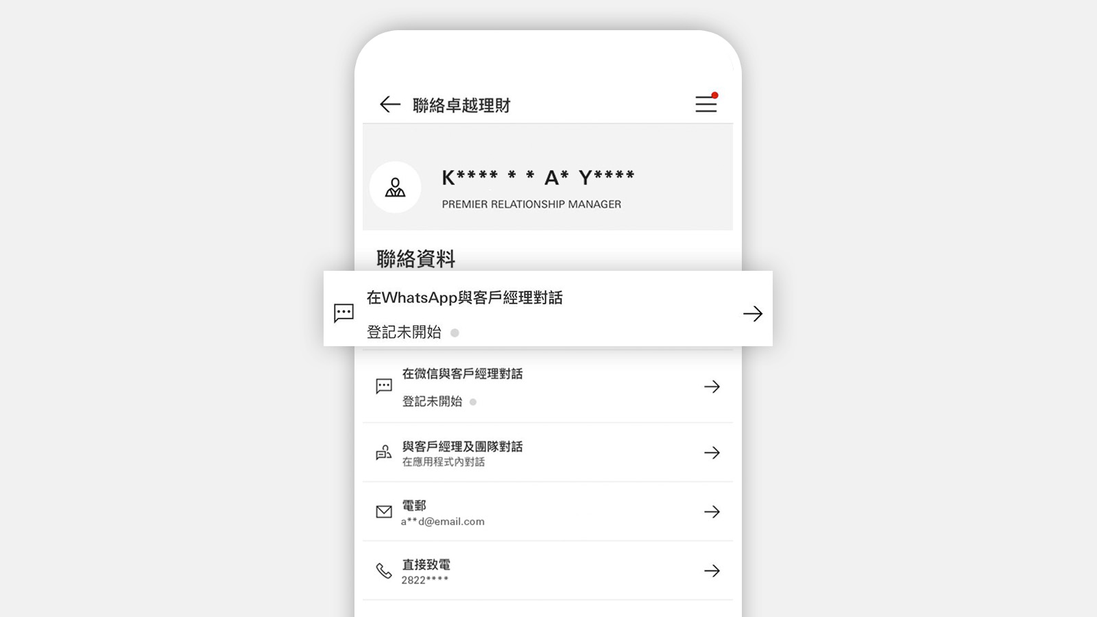 登入HSBC HK App,並點選選單圖示。選擇「聯絡滙豐卓越理財尊尚」或「聯絡卓越理財」,再選擇「在WhatsApp與客戶經理對話」。