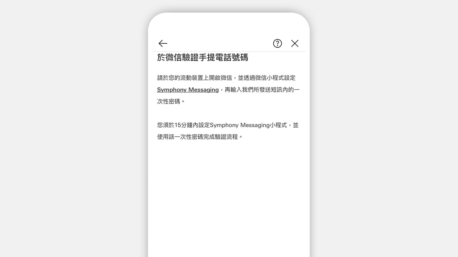 核對個人聯絡資料,然後選擇「於微信驗證號碼」,並開啟微信。在微信內的「發現」中搜尋並設定Symphony Messaging小程式,然後閱讀並接受Symphony的條款及細則。