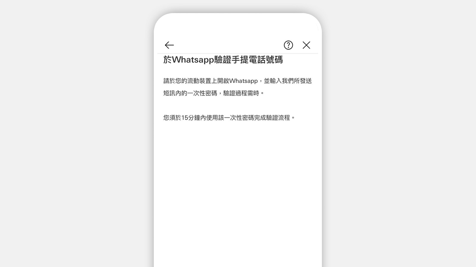 我們將會以短訊向您發送一組6位數字的一次性密碼。請在15分鐘內輸入一次性密碼,以完成身分驗證程序。驗證成功後,即可開始與客戶經理及團隊對話。