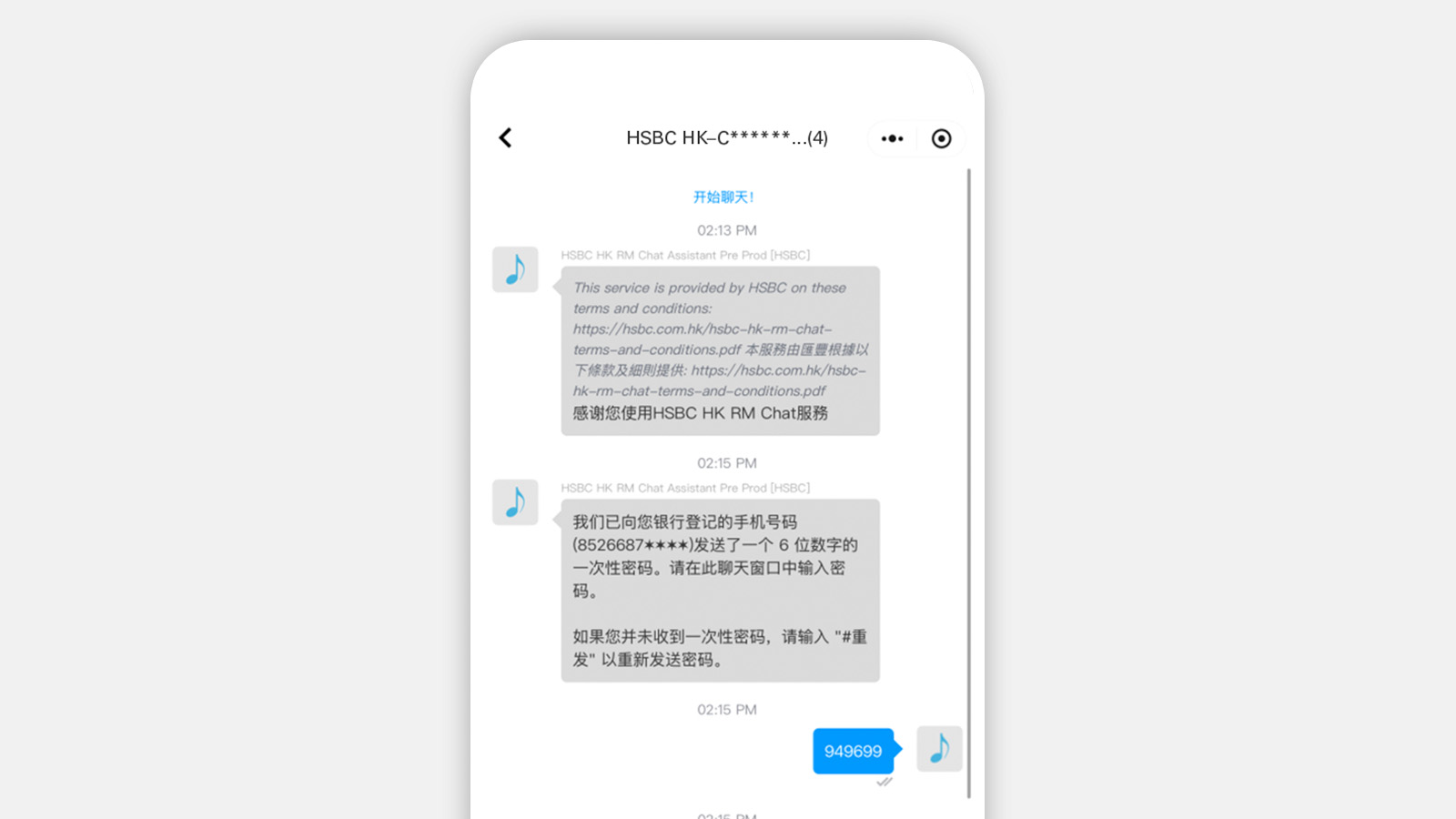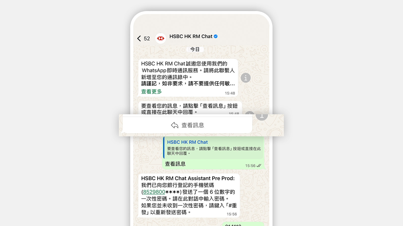 點選「查看訊息」後,我們將會以短訊向您發送一組6位數字的一次性密碼。請在15分鐘內輸入一次性密碼,以完成身分驗證程序。驗證成功後,即可開始與客戶經理及團隊對話。