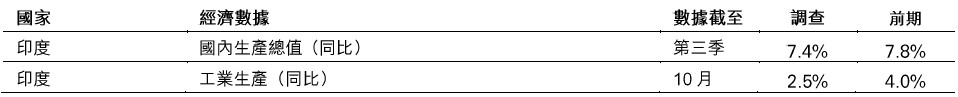 印度方面,2026財年第二季的實際國內生產總值增長可能從上季7.8%(同比)的升幅放緩至7.4%(同比),但表現保持穩健。財政和貨幣政策支援(包括下調商品及服務稅)及放寬金融規管有助抵銷關稅的不利影響。10月工業生產增長可能由9月的4.0%放緩至2.5%(同比)。
