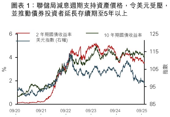 - 聯儲局重啟減息週期,推動股票、債券及黃金齊創新高。回顧歷史,聯儲局恢復寬鬆政策後的 12 個月內,股票與債券往往表現不俗;我們現時預期今年將另有兩次各 0.25% 的減息。我們對 10 年期美國國債收益率於年底的預測為 4.3%,目前收益率已低於此水平,因此我們將美國國債的存續期下調為 5 至 7 年。