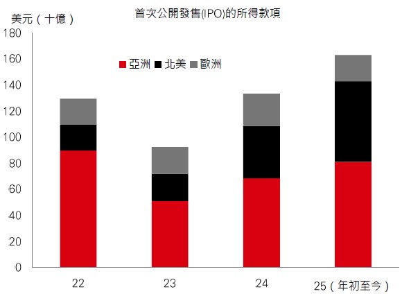 就集資額而言,亞洲首次公開發售(IPO)市場的表現冠絕全球,年初至今已集資810億美元。數字較2023年增長近60%。據行業數據顯示,關稅擔憂減退和聯儲局減息,令第三季IPO市場更為強勁。尤其是香港重奪新股上市中心的地位,這受惠於其「第二上市」支援政策,及設有快速通道吸引科技企業。中國內地境內市場及其他東盟中心亦蓬勃發展。印度表現突出,各個行業的新股上市數量急增,零售需求強勁。