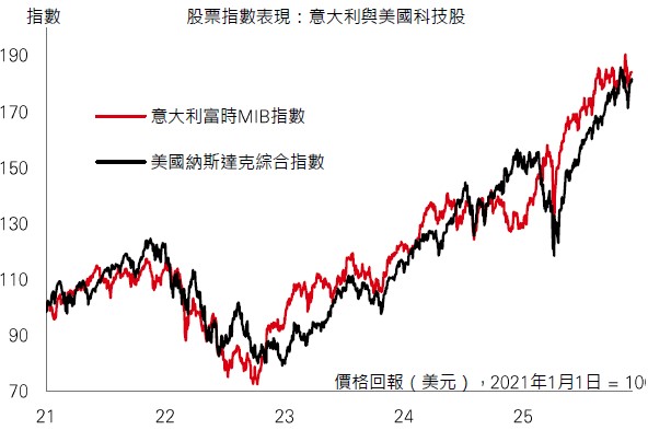 不過,意大利股市的表現卻截然不同。雖然科技和人工智能備受追捧,但意大利富時MIB指數年初至今的表現竟悄悄跑贏美國納斯達克指數。這並非短暫現象——自2021年初以來,意大利股市的升幅一直與美國科技股比肩。背後的動力主要源自於行業組成,意大利富時MIB指數主要由銀行、能源和工業周期股構成,這些股票在高利率及通脹,以及商品價格波動的環境下表現相對出色。政府債券息差下降亦推高了股票市盈率。