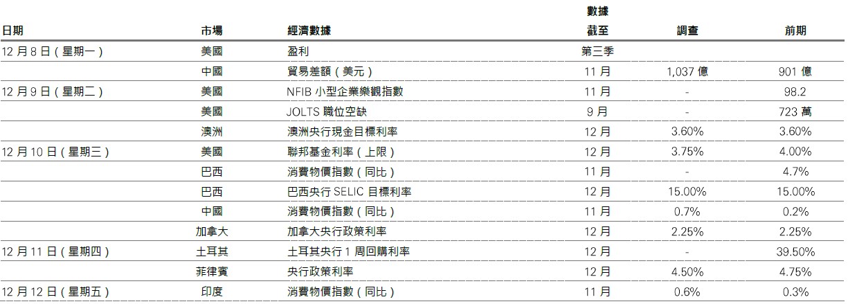 資料來源:滙豐投資管理。數據截至2025年12月5日(英國時間上午7時30分)。僅供參考,不應視為投資特定國家、產品、策略、行業或證券的建議。所表達的任何觀點均截至編製為止,如有更改,恕不另行通知。所提供的任何預測、預計或目標僅供參考,概非任何形式保證。滙豐投資管理對未能達到該預測、預計或目標,概不承擔任何責任。美國政府停擺終結,但預期官方數據公布仍有機會推遲