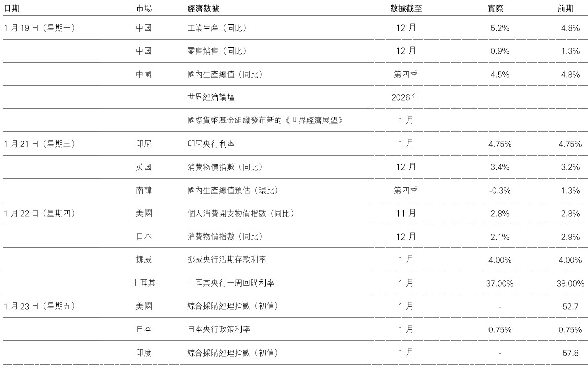 過往表現並非未來回報指標。息率水平不獲保證,日後可升或可跌。僅供參考,不應視為投資特定國家、產品、策略、行業或證券的建議。多元化並不能確保盈利或防止虧損。所表達的任何觀點均截至編製為止,如有更改,恕不另行通知。指數回報假設所有分派再投資,不反映費用或開支。您不能直接投資於指數。所提供的任何預測、預計或目標僅供參考,概非任何形式保證。成本可能因匯率波動而變化。資料來源:滙豐投資管理。Macrobond及彭博。數據截至2026年1月23日(英國時間上午7時30分)。