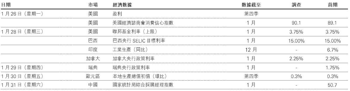 地緣政治憂慮加劇,令金融市場上周波幅加劇。金價急升,美元兌一籃子主要貨幣回落。日本方面,財政不確定性增加,使長期政府債券息率受壓,息率曲線在2月大選前夕趨陡。歐洲長期主權債息普遍攀升,美國十年期國庫券息率微升,聯邦儲備局下周將公布利率決定。美股方面,小型股羅素2000指數延續近期優秀表現,科技股則落後。道瓊斯歐洲50指數本周低收,日本政府債券息率波動加劇,帶動日經225指數略跌。新興市場股市上揚,其中拉丁美洲股市領漲。亞洲新興市場指數個別發展: Kospi指數創新高,而Sensex指數下跌。