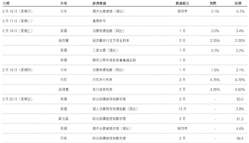 環球股市保持穩定,本周交易日數因假期縮短。歐洲方面,道瓊斯歐洲50指數和英國富時100指數同創歷史新高。美國方面,標普500指數本周升幅溫和,而板塊輪動仍是重要主題,投資者繼續從相對昂貴的科技股轉投工業和材料等周期板塊。日經225指數在近期上揚後整固。亞洲新興市場因農曆新年假期普遍休市,而以科技股主導的Kospi指數繼續保持強勁升勢。拉丁美洲股市個別發展。據1月FOMC會議紀錄顯示,部分成員認為適合維持目前政策「一段時間」。美元兌主要貨幣普遍轉強,十年期美國國庫券窄幅波動。商品方面,受地緣政局憂慮影響,油價上漲。