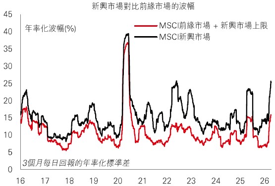 新興市場資產在伊朗衝突發生至今所展現的韌力受到了不少討論。過去數年,新興市場經濟體經歷了徹底變化(例如財政和對外平衡有改善,及政策框架改進),因此上述的討論相當合理。但同樣令人印象深刻的是前緣市場股票在期間的表現。其最大跌幅僅約8%,而新興市場則達到13%。