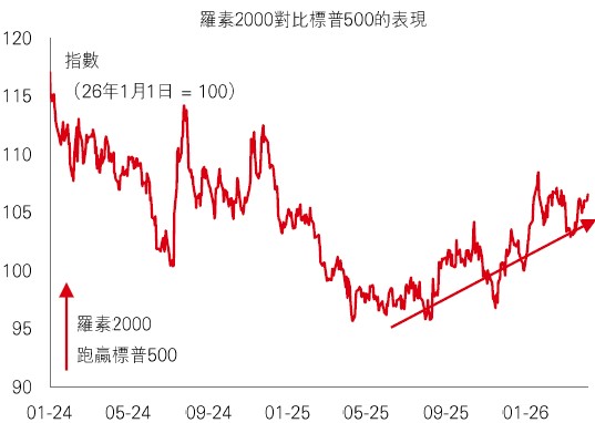 去年夏季以來,小型股持續跑贏大型股,此乃受到2026年將進一步減息的預期推動。因此,當市場上月重新調整預期至較鷹派的方向時,小型股會因而重挫是合理推論。但實際上,小型股在初期遭拋售後便迅速反彈。