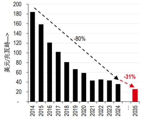 到 2035 年,全球太陽能平準化成本預計下降 31%