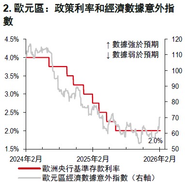 與此同時,歐洲央行2 月份維持利率不變,符合預期,但語氣略顯鷹派,強調經濟增長具有韌性(圖2)。歐洲央行行長克拉加德(Christine Lagarde)淡化了近期的通脹下降,並暗示利率將在一段時間內保持不變。她還對歐元走強不以為然,指出匯率變動已反映在預測中,且歐元仍處於長期均值區間內。