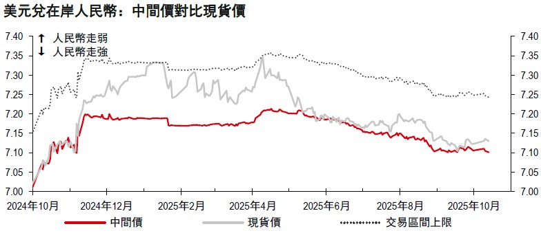 今日(10 月13 日)美元兌在岸人民幣中間價為7.1007,為去年11 月美國大選以來的最低水平。這表明,儘管受到關稅威脅,中國的外匯政策仍保持穩定。在四中全會(10 月20 日至23 日)之前,中國政府可能會優先考慮國內市場穩定。儘管如此,概率雖低但影響重大的風險在於,我們可能會看到另一輪互加關稅(而不僅僅是威脅),就像4 月初發生的那樣。當時,美元兌在岸人民幣中間價從7.17 上升至7.21 左右,現貨價接近美元兌在岸人民幣交易區間上限。但從積極的角度看,今早美國總統特朗普(Donald Trump)的語氣有所軟化,副總統萬斯(JD Vance)稱這一切都是正在進行的談判(彭博資訊,2025 年10 月13 日)。