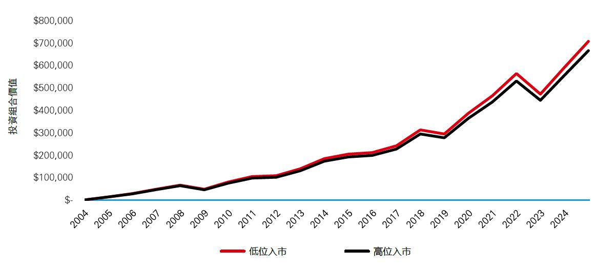 圖表1顯示了自 2004 年 1 月以來每月在環球股票的低位或高位投資 1,000 美元的表現。無論是在每月低位還是高位入市,最終價值都未見有明顯差異。