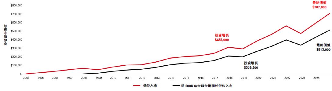 在圖表2中,黑線代表一位投資者等待市場大幅下跌才開始投資。儘管這位投資者的時機恰到好處,不僅每月在市場低位入市,更在市場崩盤期間,即股值處於特別低位的時候開始進場,但最終回報卻差得多。較早開始(紅線)意味著在此期間多投資 48,000 美元,利用複息的力量創造了額外 193,800美元價值。
