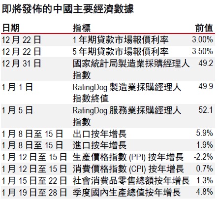 在房地產方面,中央經濟工作會議強調透過因城施策穩定房地產市場的重要性,包括控制新增供給、減少庫存、優化住房結構,以及將存量商品房轉變為保障性住房。這一表態力度強於此前預期。如果政府進行更大規模的干預,例如動用中央財政資金將住房資產從銀行資產負債表剝離並消化住房存量,或會更有效地穩定房地產行業。